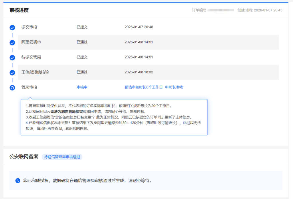 是这样的,我在阿里云上购买的域名al-right.top目前正在ICP备案中的管局审核阶段